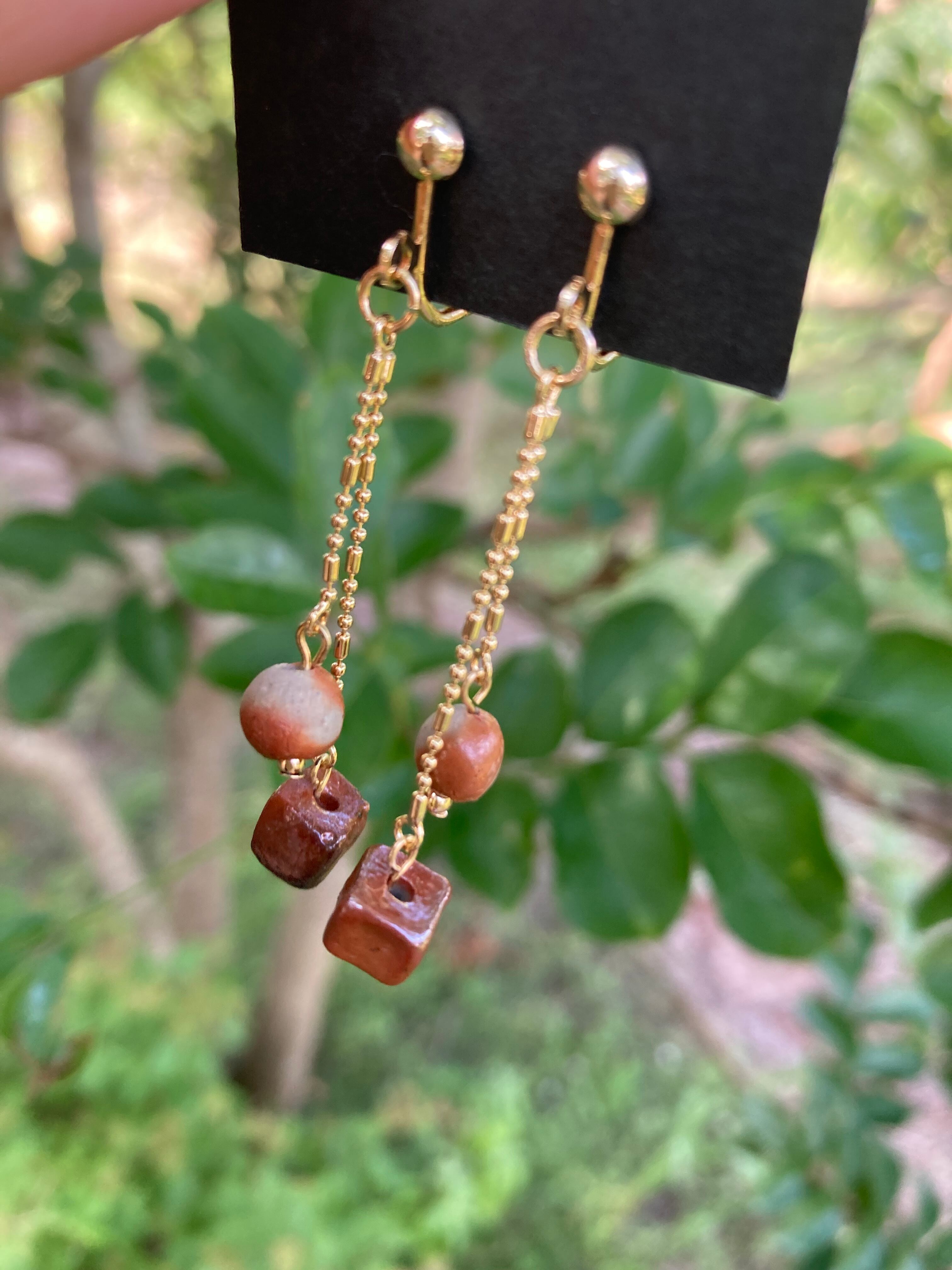 キューブと丸粒の備前焼ビーズが揺れるイヤリング。ゴールドのメタルビーズと合わせてシンプルに仕上げました。
