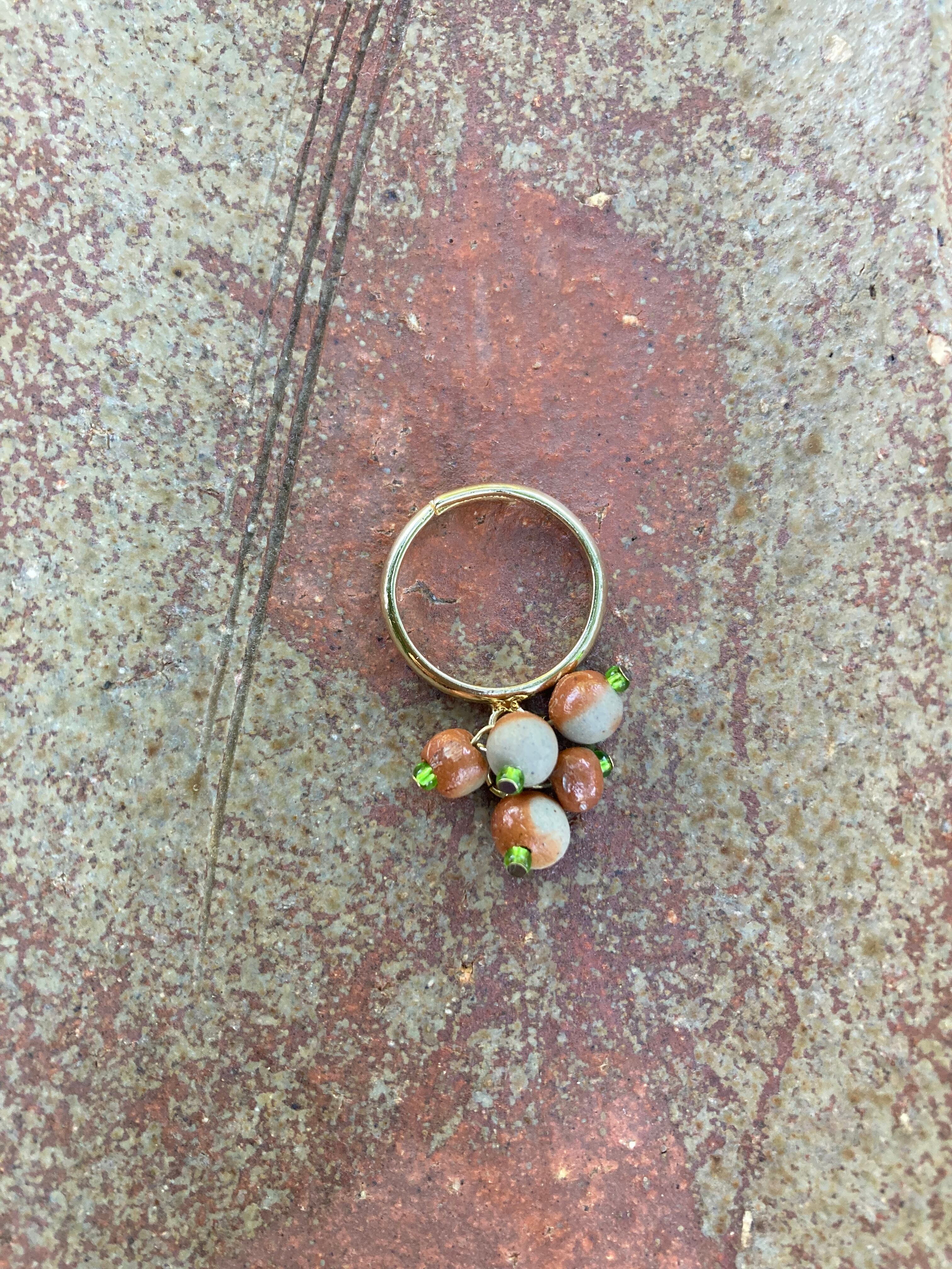 備前焼の丸粒ビーズが揺れるリングです。