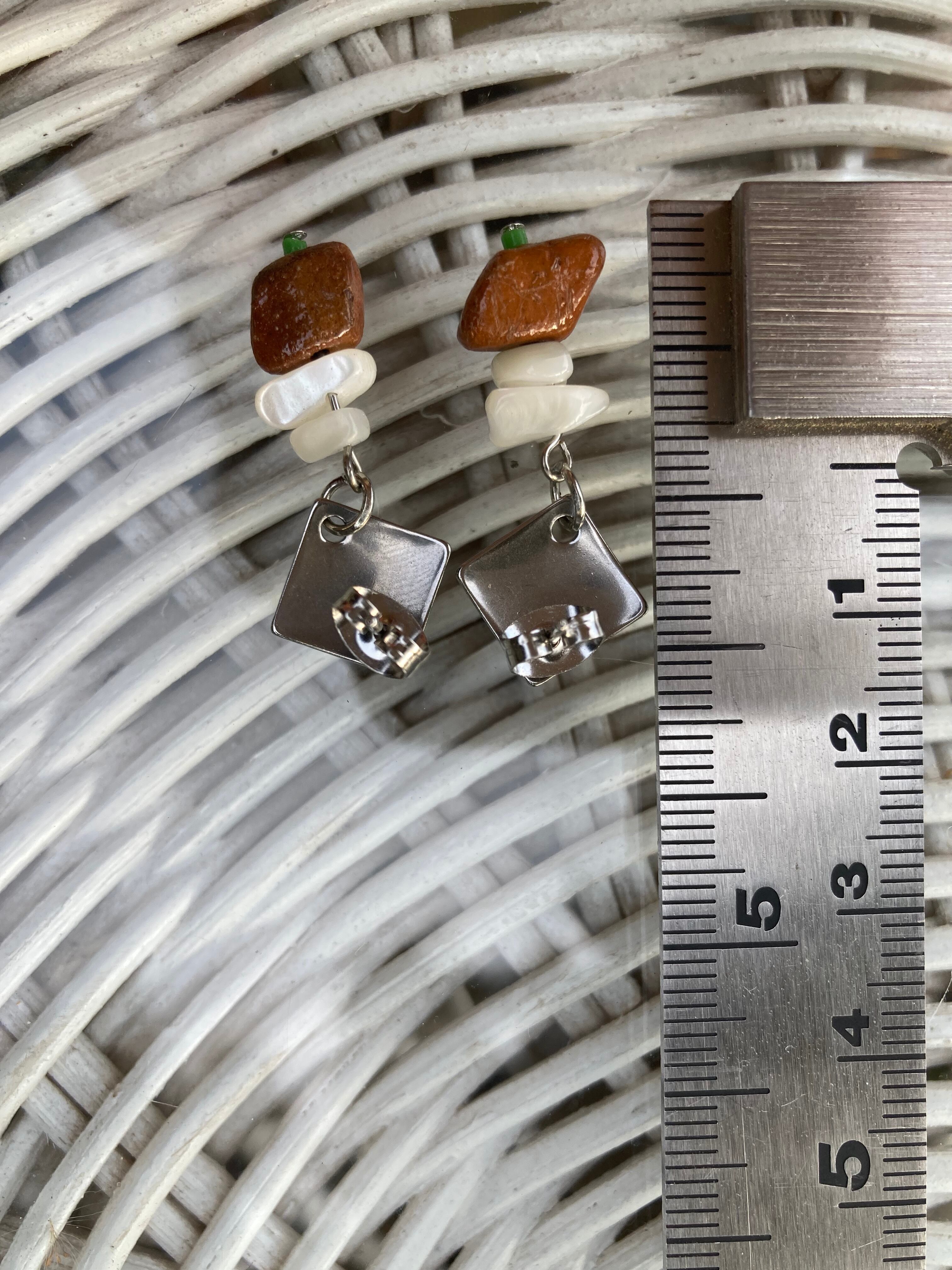 ひし形のピアス金具に天然石(確かイエロージェイド)、備前焼の組み合わせ。