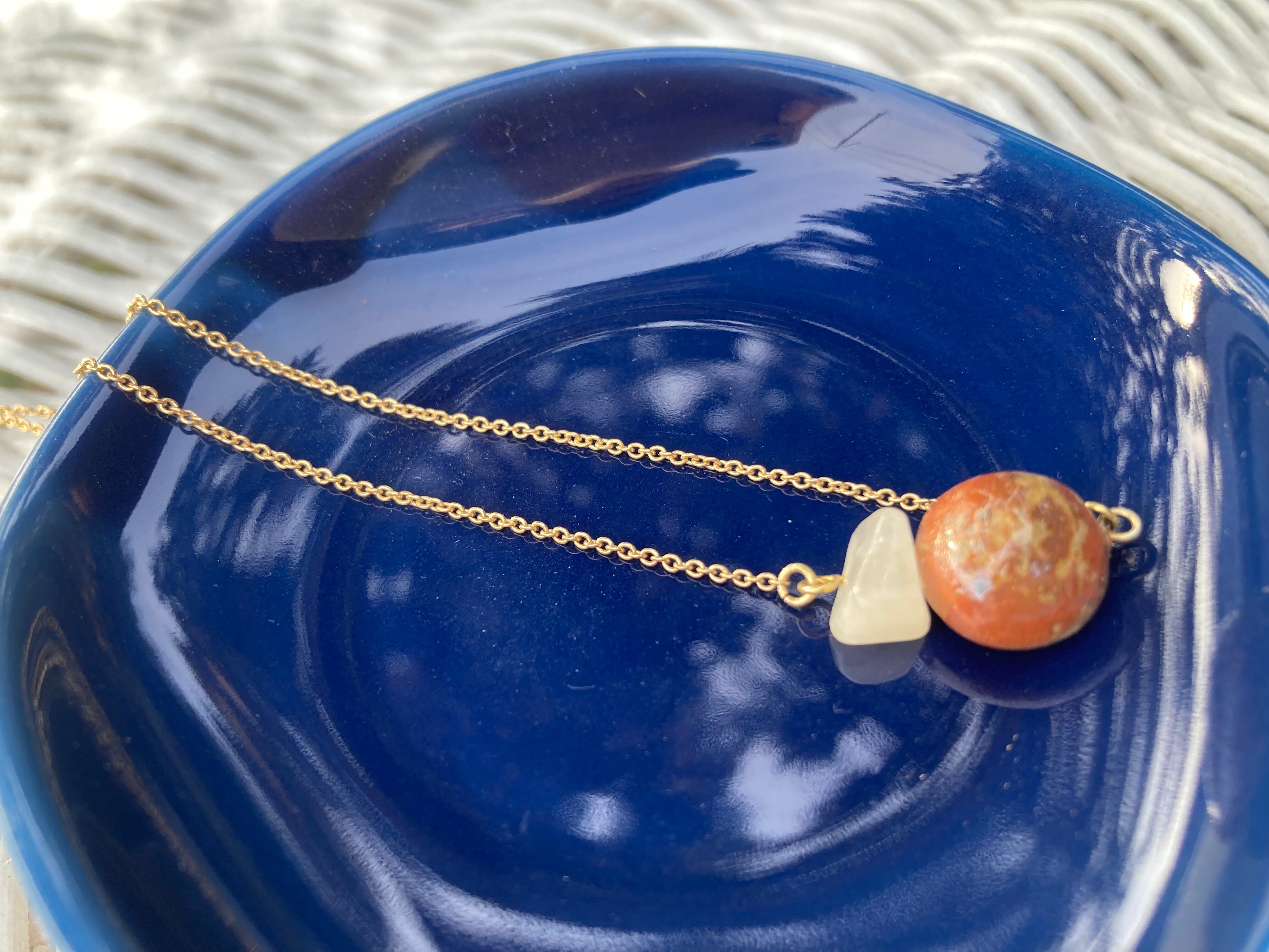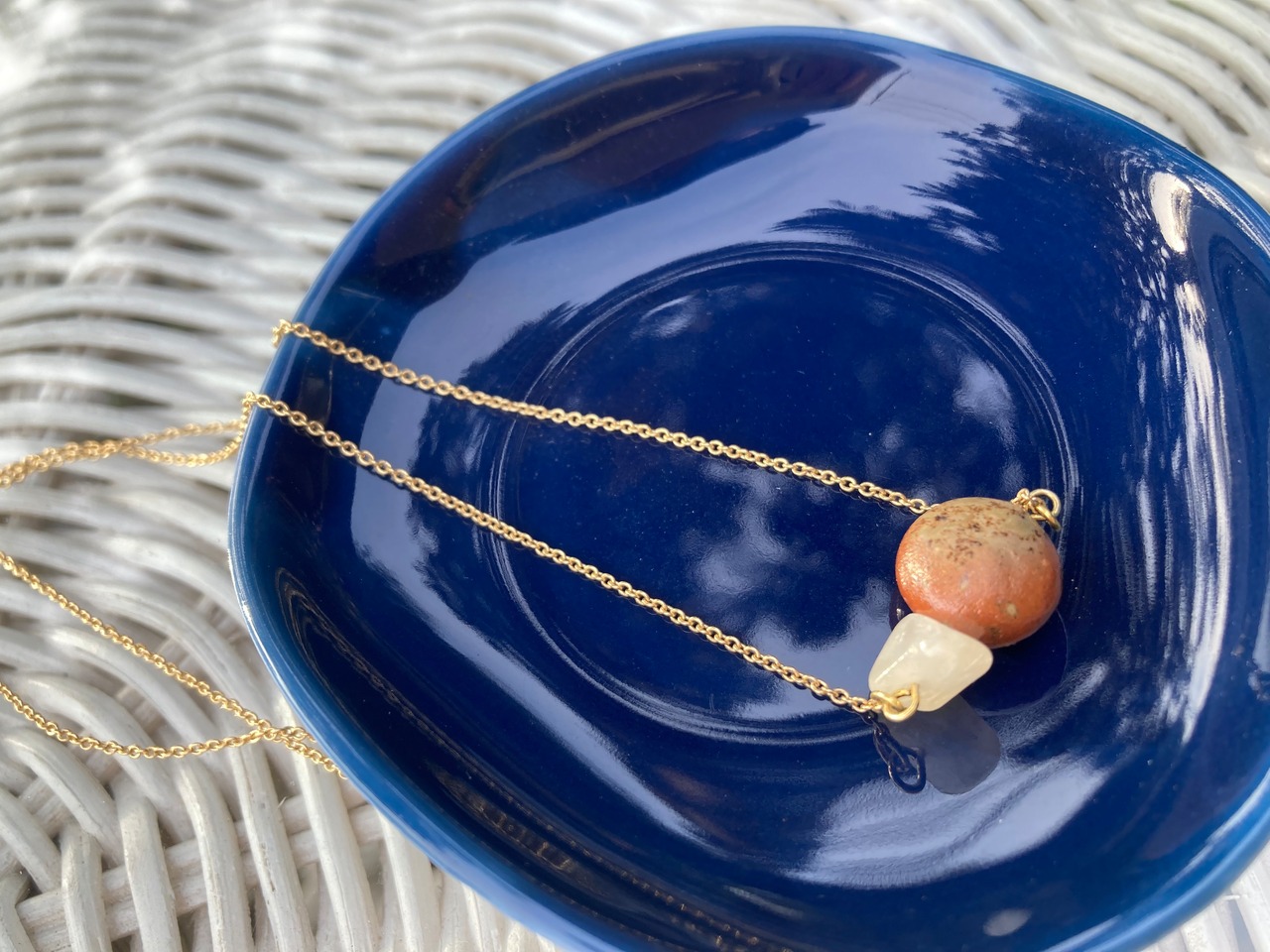 胡麻(備前焼を焼く時に灰をかけで作るガラス質の模様)によって艶のあるきれいな備前焼ビーズとイエロージェイド(天然石)のネックレス。